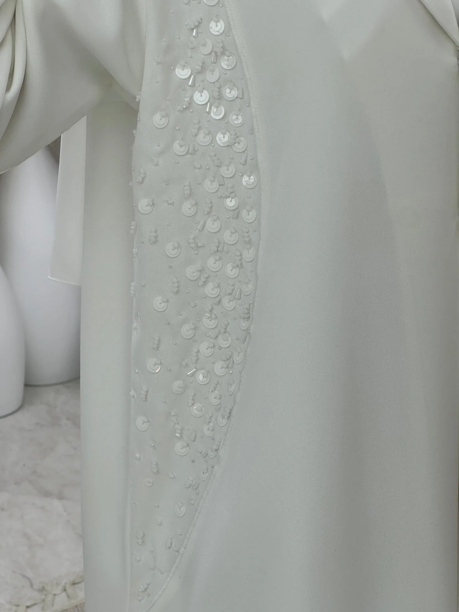 Introducing the C 0204-01 White Beaded, a luxury abaya uae crafted from exquisite beaded. This bespoke piece embodies the perfect fusion of traditional elegance and contemporary sophistication, designed exclusively for the discerning woman who values both modesty and style.