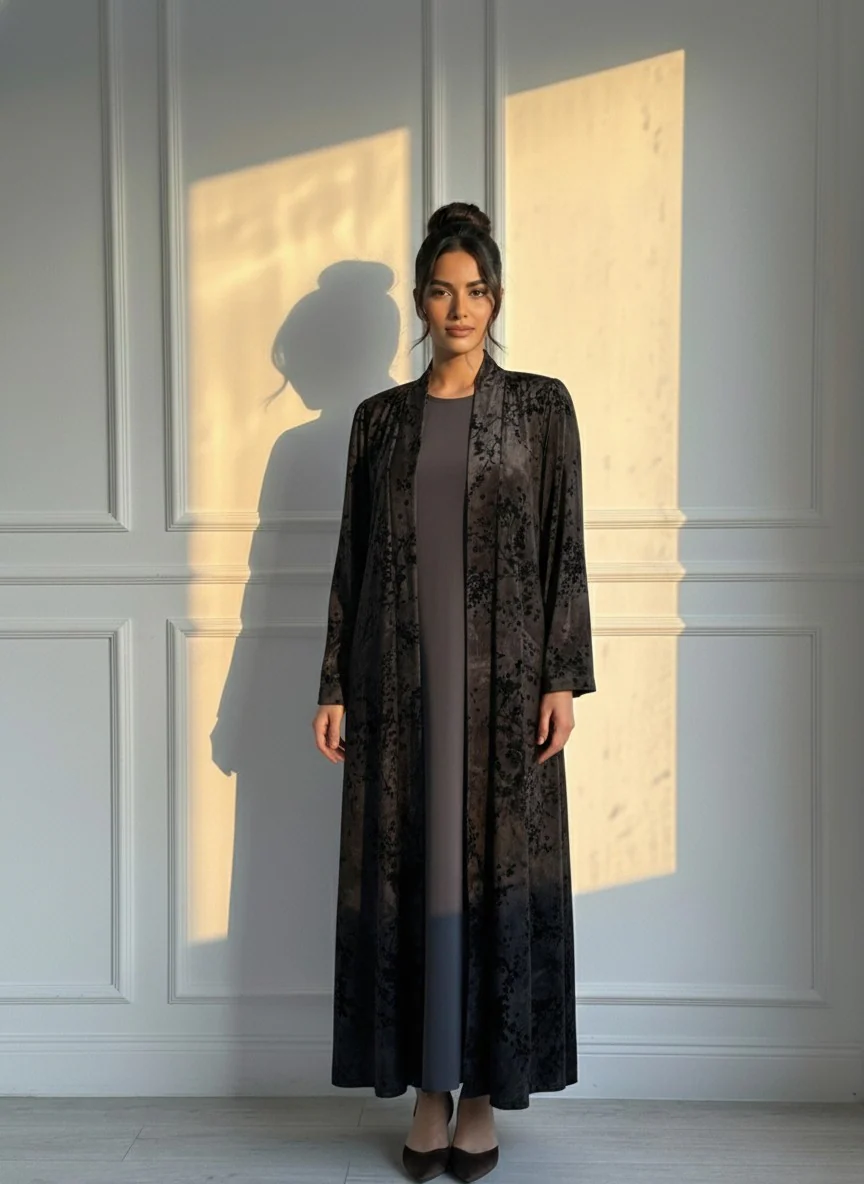 Experience refined elegance with the CAS Abaya Brown Floral Velvet Abaya, thoughtfully crafted for timeless modest style. Made from premium velvet fabric, this abaya features a soft, plush texture with a rich drape that enhances its flowing silhouette.