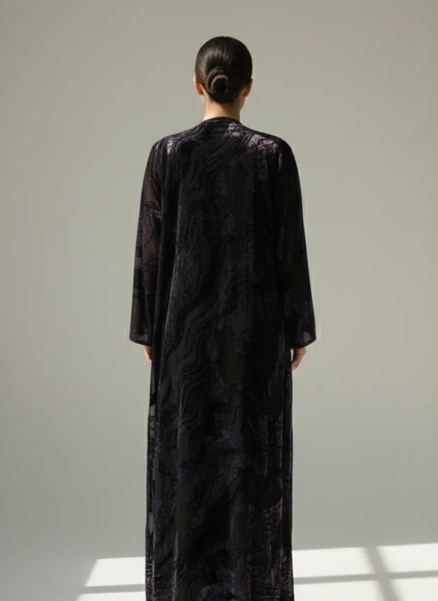 The lightweight chiffon ensures elegant movement, while velvet accents provide texture, warmth, and sophistication—ideal for evening wear, Ramadan gatherings, Eid celebrations, winter occasions, and formal events. Perfect for women searching where to buy abaya in Dubai, this design blends premium craftsmanship with timeless elegance.