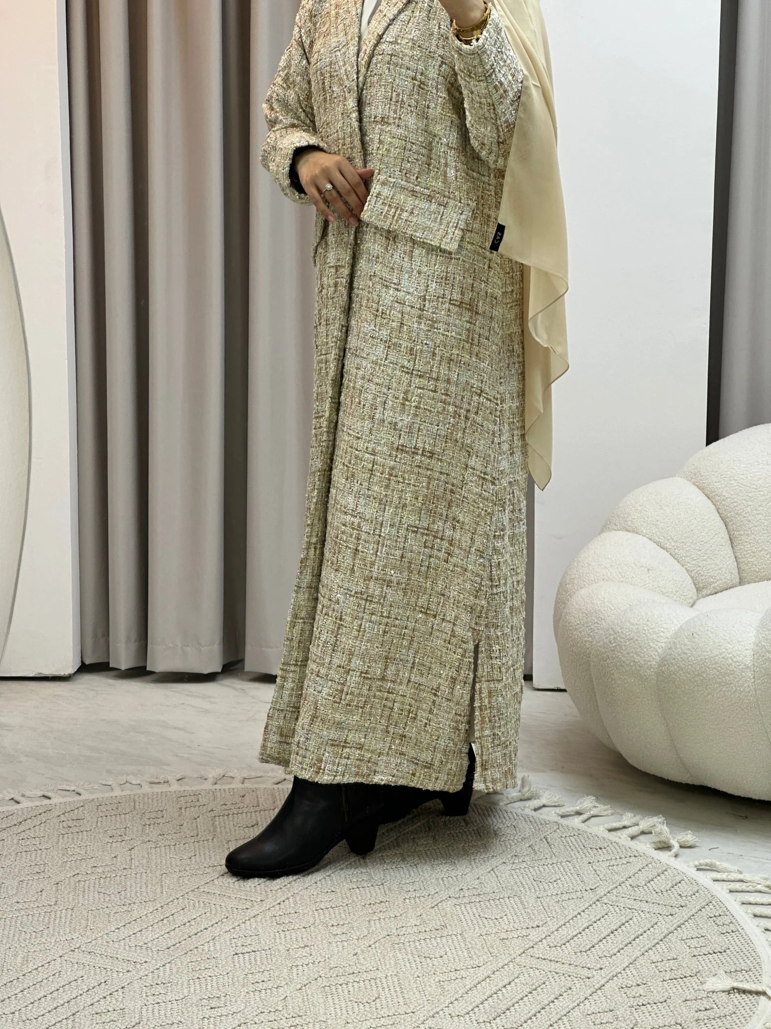 Beige Tweed Winter Abaya Beige double-breasted coat style tweed abaya with front pockets and folded cuff sleeves.