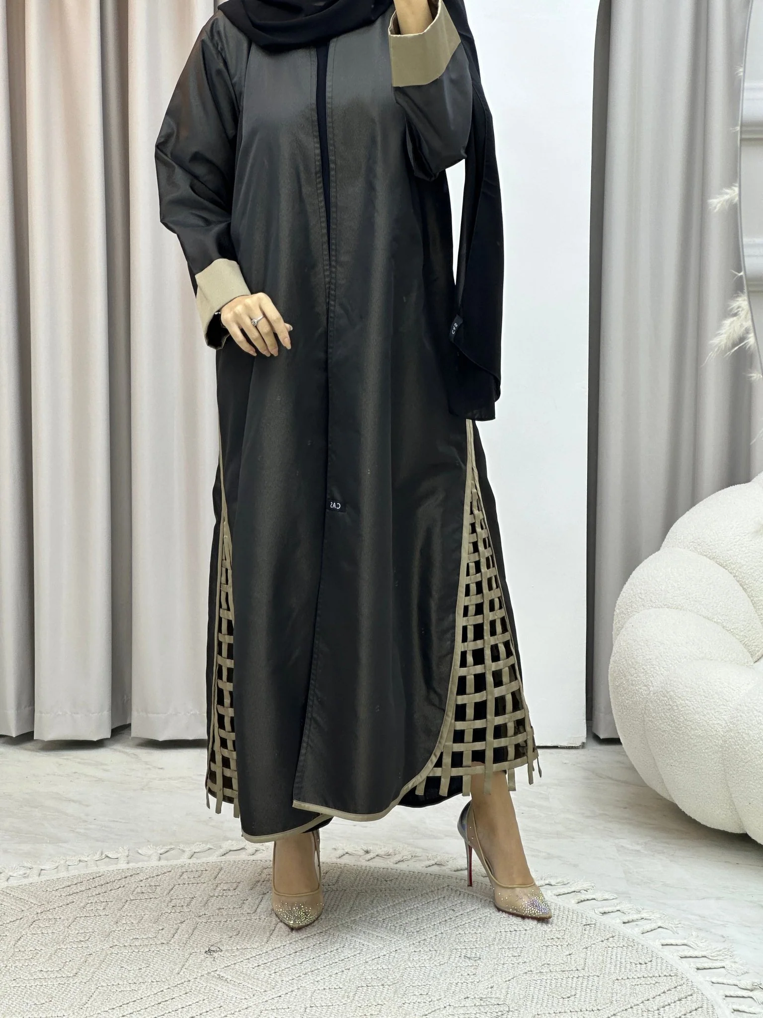 This abaya set is crafted from luxurious bridal satin fabric. Featuring a timeless straight cut and cuffed beige sleeves, the set is completed with panels of beige mesh design on both sides, creating a truly elegant aesthetic.