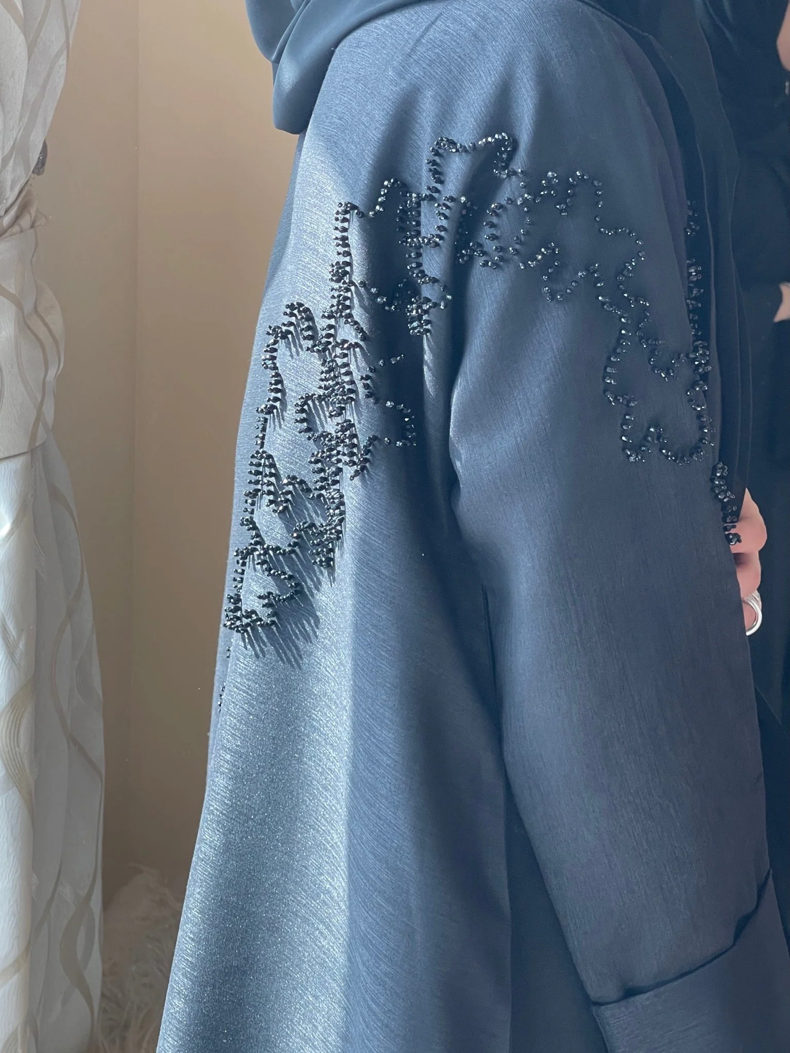 Beadwork on front, shoulder and back of abaya.
