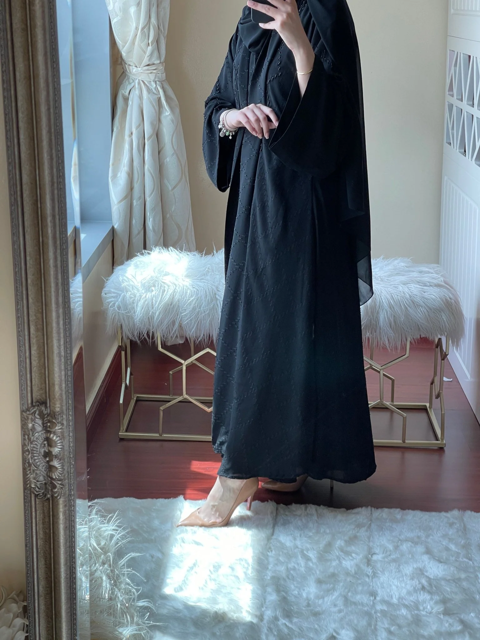 Black formal kloosh abaya with French sleeves and beadwork.