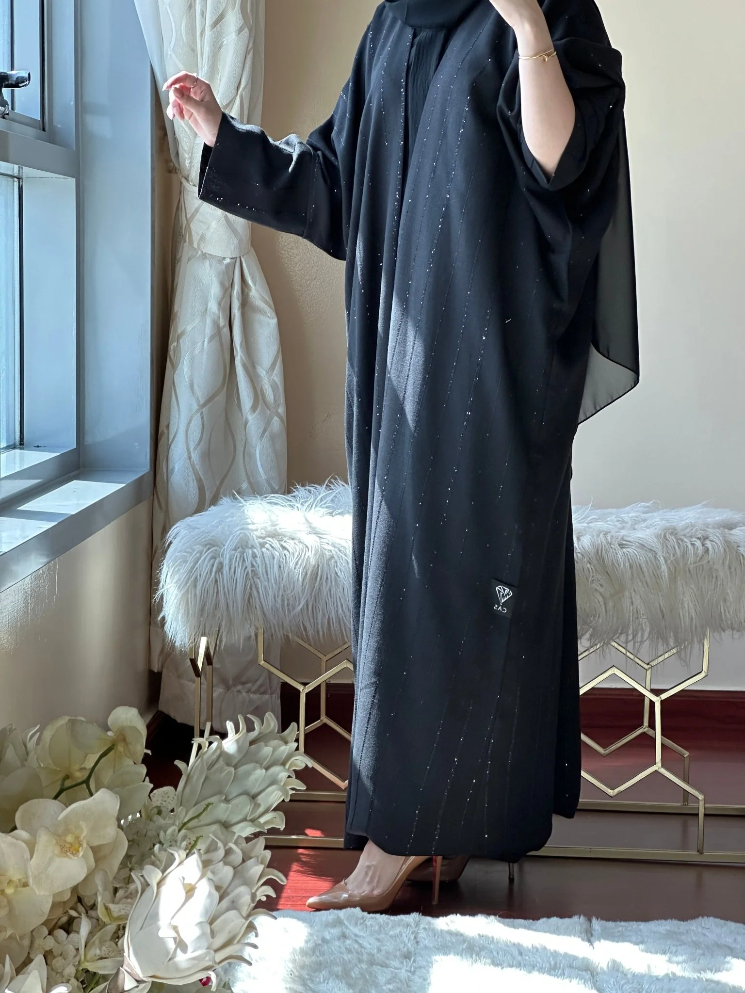 This summer look features a striped bisht linen abaya adorned with sparkling sequin embellishments.
