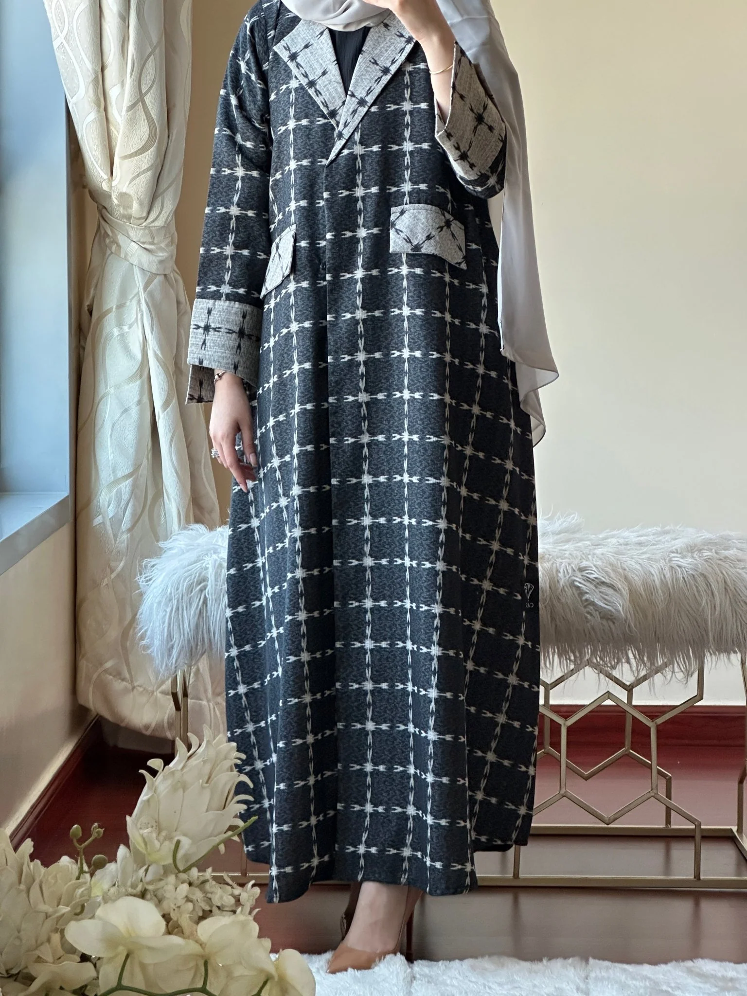 The perfect piece of clothing for the summer season. It is designed with a checkered print that is sure to turn heads. This coat-style linen abaya has contemporary sleeves and two convenient front pockets. Its breathable lightweight linen fabric allows for maximum comfort in the summer heat.