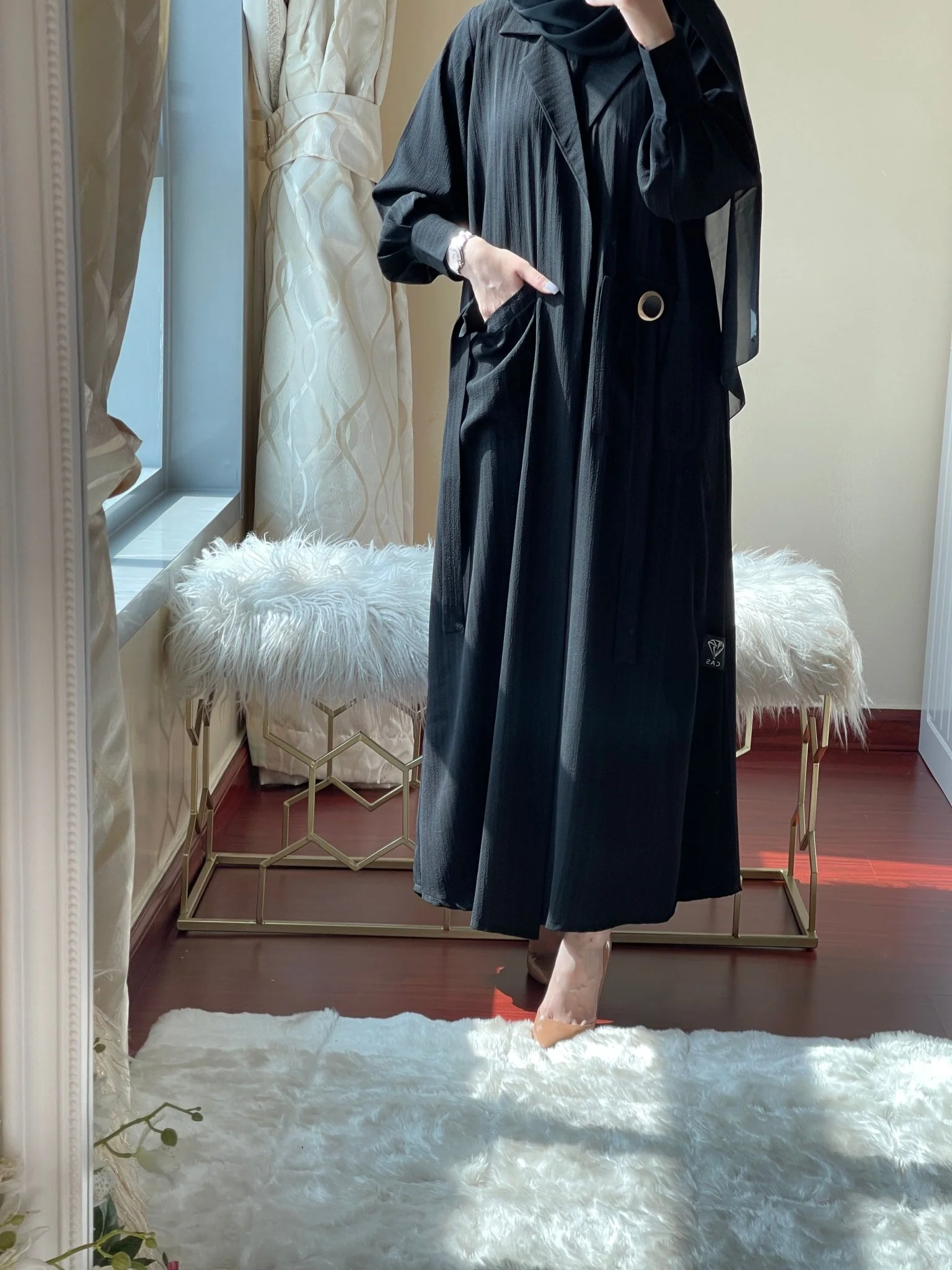 Coat-style self-print abaya with cuffed sleeves, oversized pockets and hanging straps.