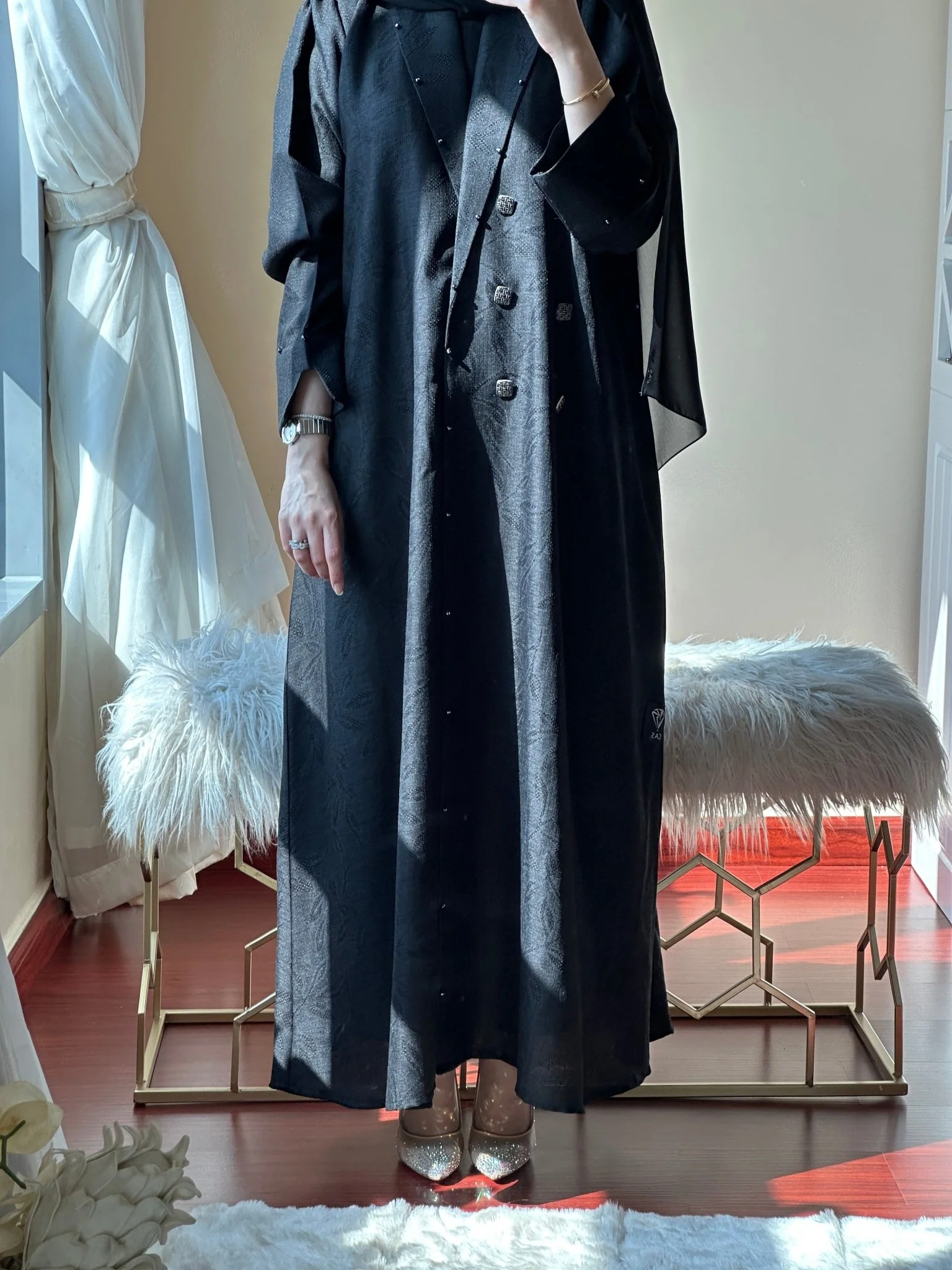 Coat style printed linen abaya with pleated shoulders and embellished with square buttons.