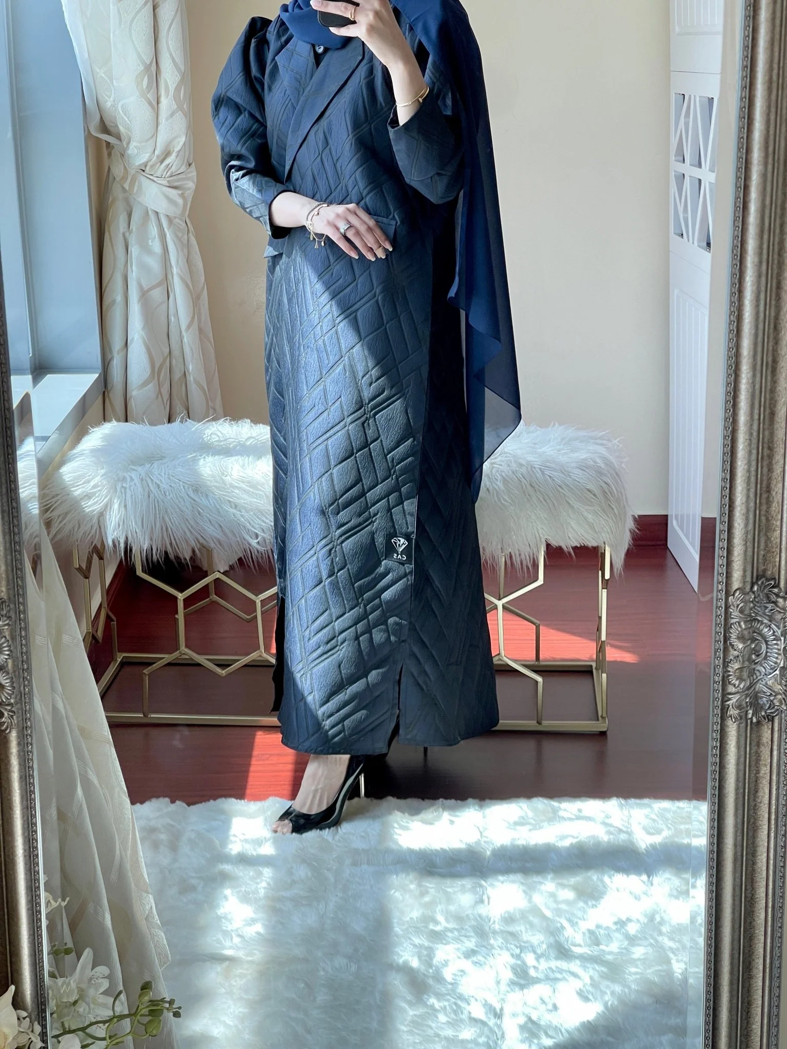 Ramadan/Eid ‘22 Collection: Blue coat style jacquard abaya with straight sleeves and puffed shoulders.