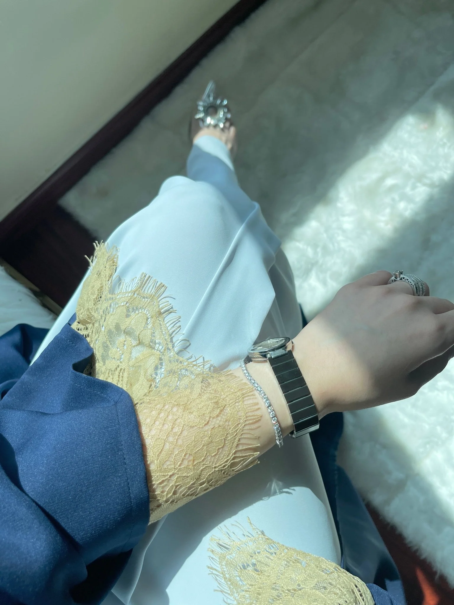 Embrace refined sophistication with this 2 Piece Navy Blue Abaya Set from CAS Abaya Dubai. Crafted from luxurious Crepe and CEY fabric, this elegant blue abaya features delicate beige Chantilly lace detailing on the sleeves, paired with a matching sheila for a complete and graceful look. Perfect for formal events or everyday elegance, it’s a timeless favorite among women across Dubai and the GCC.