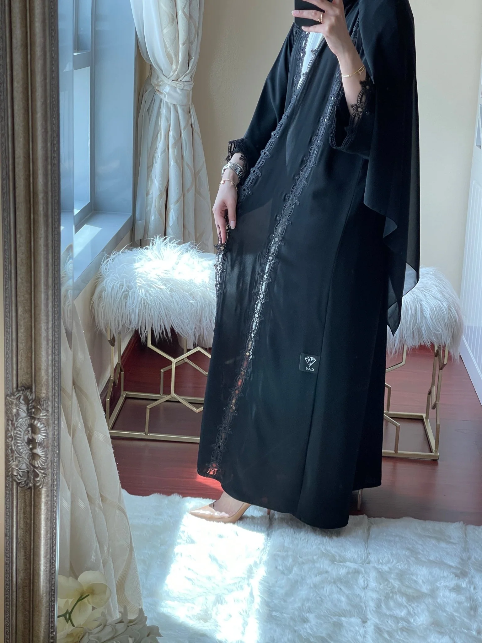 Classic bisht style abaya with laced panels and sleeves.