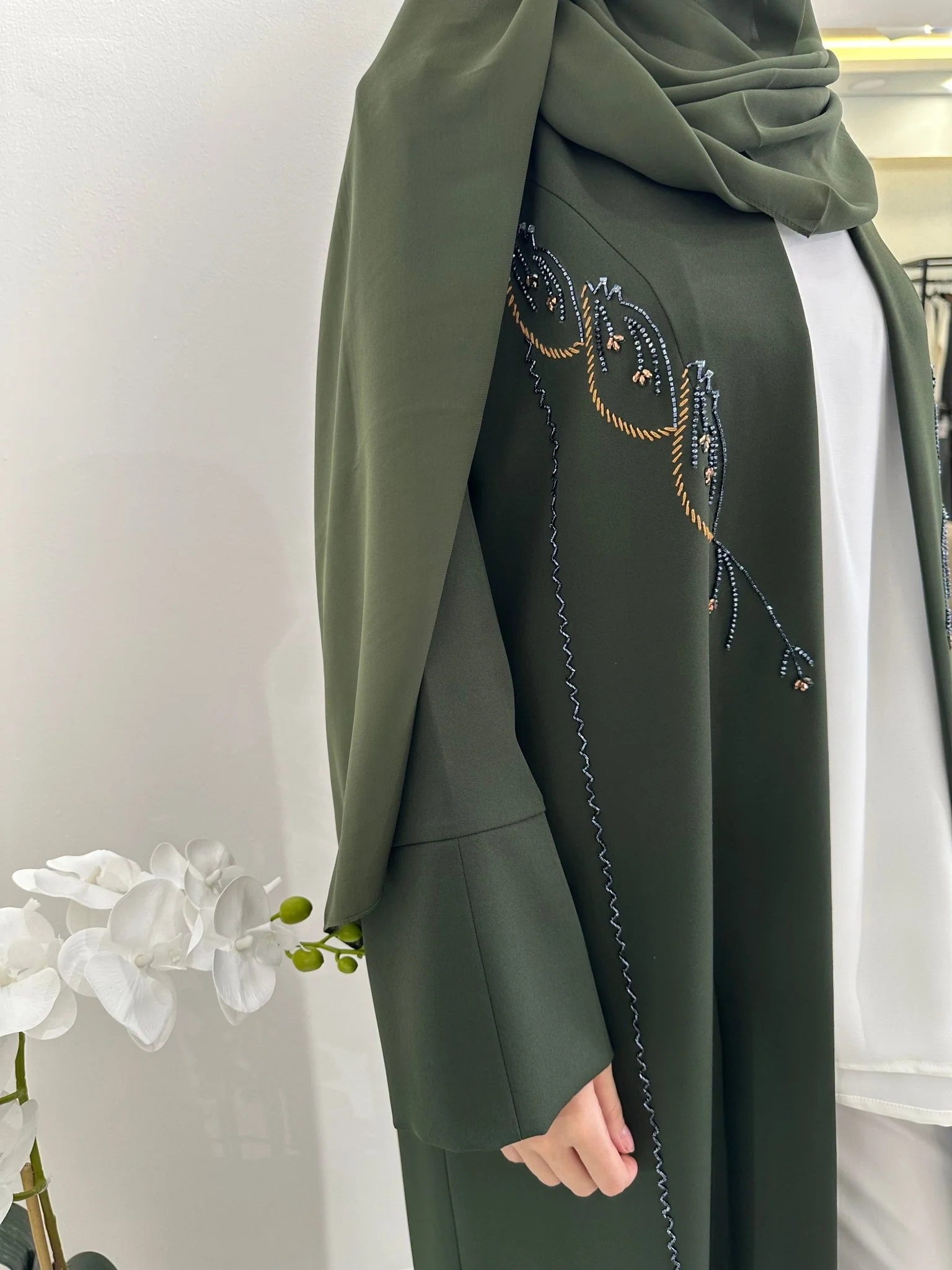 Dark Green Beaded Eid Abaya by CAS Abaya is a luxurious statement piece for festive celebrations. Crafted from lightweight, flowing fabric, this Elegant Emirati abaya features intricate beadwork that adds shimmer and sophistication. The deep green hue exudes elegance and complements modern Dubai abaya styling, while the flowing silhouette ensures comfort and graceful movement. Perfect for Eid gatherings, evening events, or special occasions, it embodies timeless refinement.