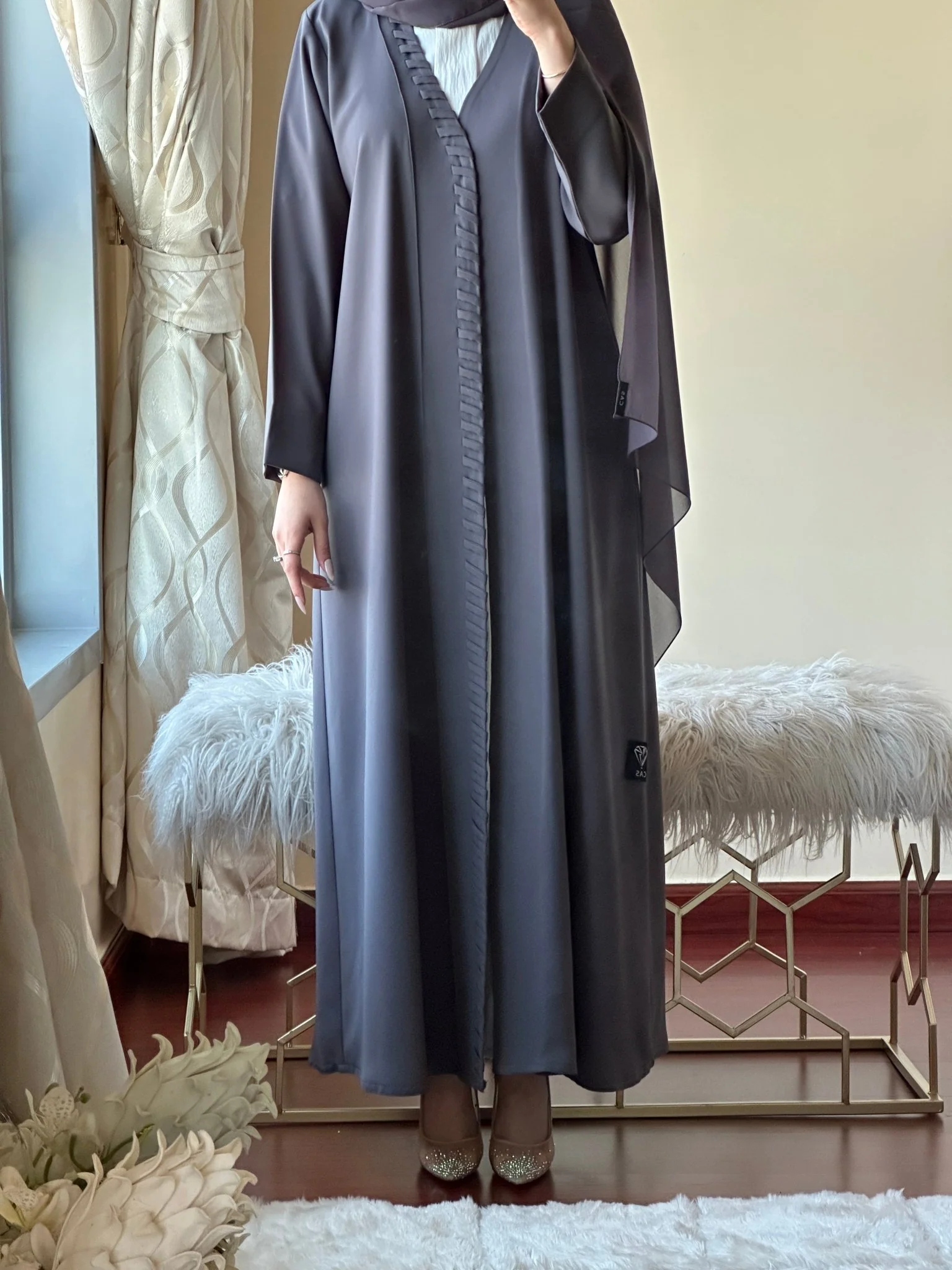 Introducing the C-Dark-Grey-Crepe-Summer-Abaya, a stunning dubai abaya crafted from exquisite crepe. This bespoke masterpiece embodies the perfect fusion of traditional elegance and contemporary sophistication, designed exclusively for the discerning woman who values both modesty and refined style.