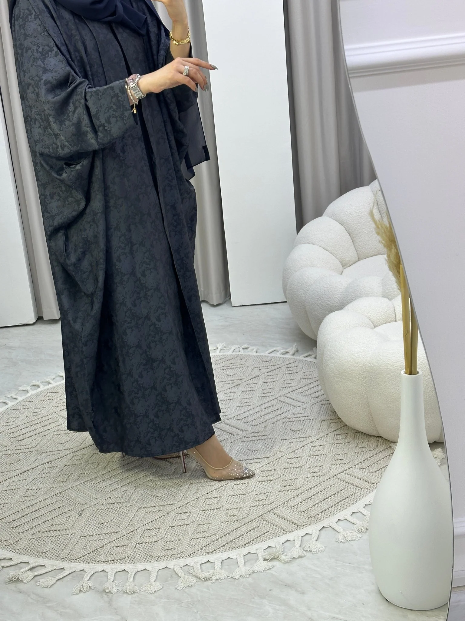This navy blue bisht-style abaya offers a self-print design and straight-fitted sleeves, crafted from a soft, lightweight fabric that's perfect for the summer.