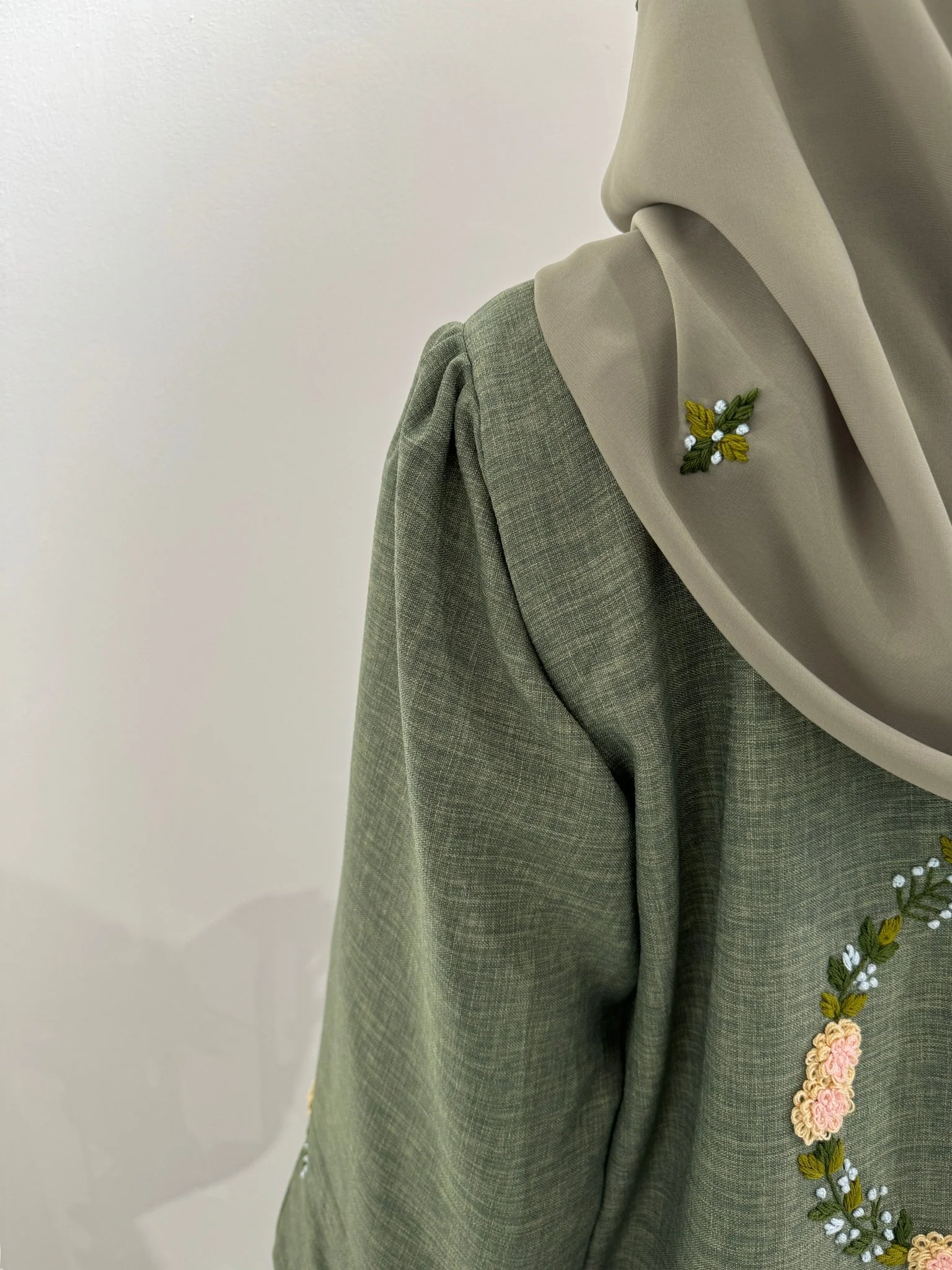 C Green Floral Linen Embroidery Eid Abaya