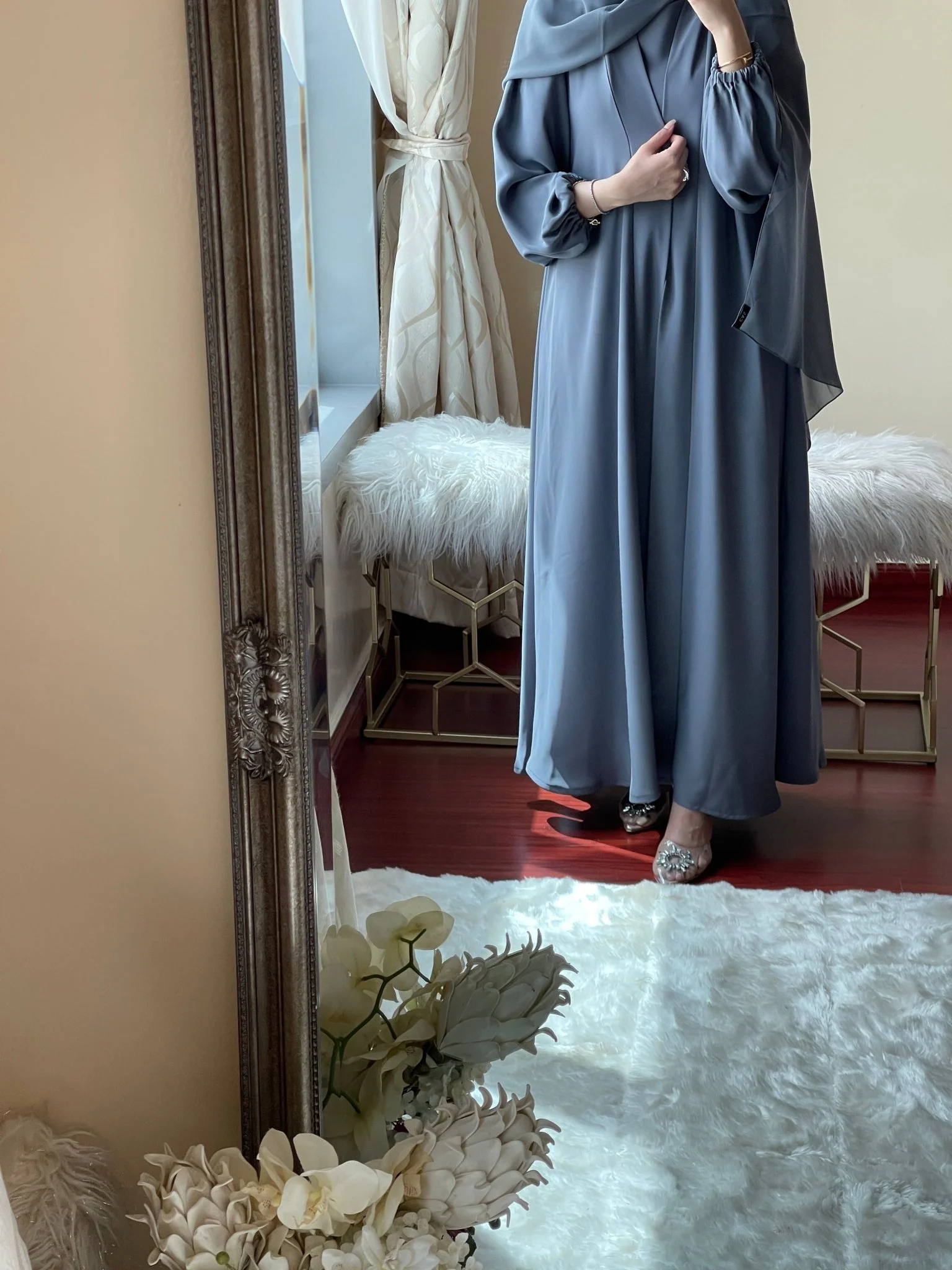 Introducing the C-Grey-Nada-Abaya, a stunning dubai abaya crafted from exquisite nada. This bespoke masterpiece embodies the perfect fusion of traditional elegance and contemporary sophistication, designed exclusively for the discerning woman who values both modesty and refined style.