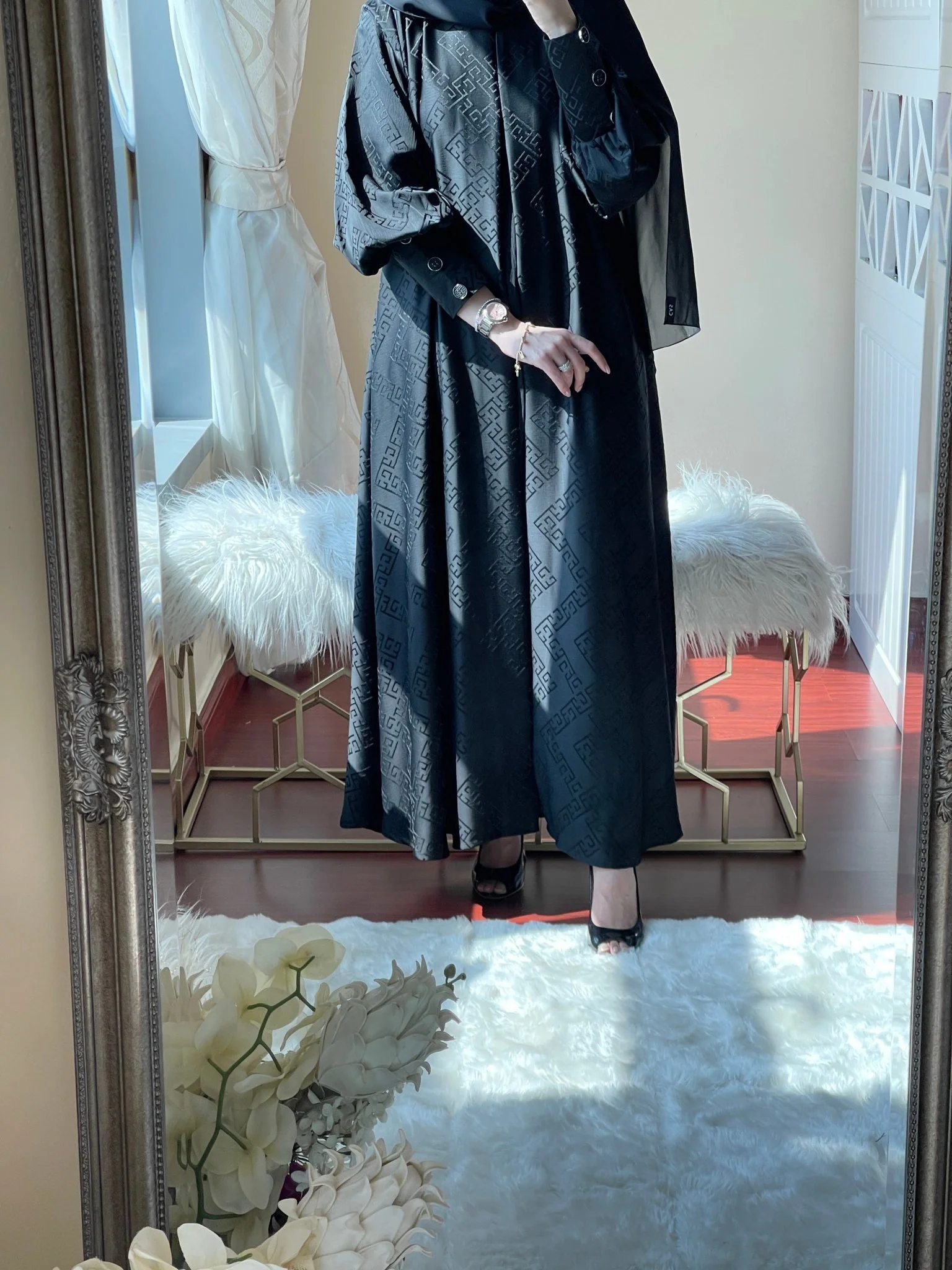 Ramadan/Eid ‘22 Collection: Black “kloosh - style” jacquard abaya with a combination of balloon and cuffed sleeves.