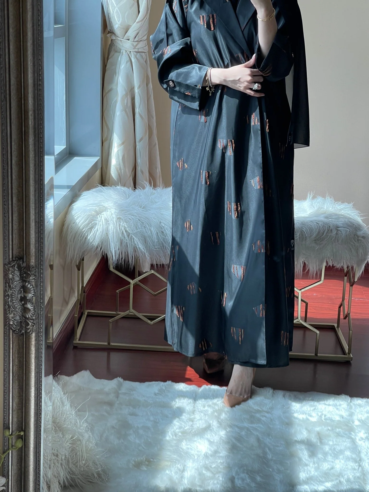 Ramadan/Eid ‘22 Collection: Black/orange self-print coat style jacquard abaya with cuffed sleeves.