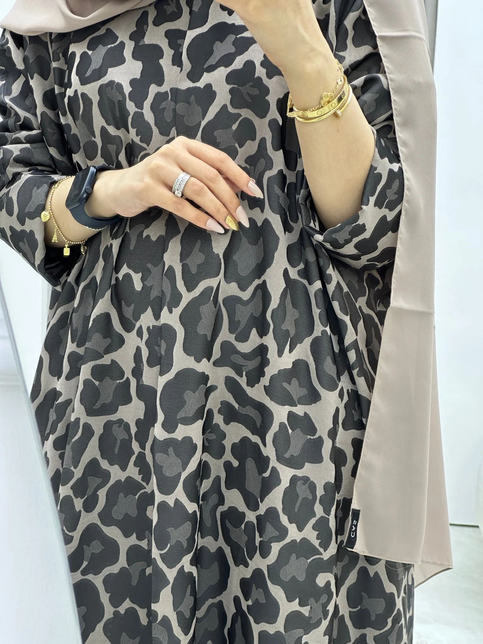 This elegant winter abaya features a classic round neck bisht cut and straight sleeves, adorned with an alluring animal print pattern.