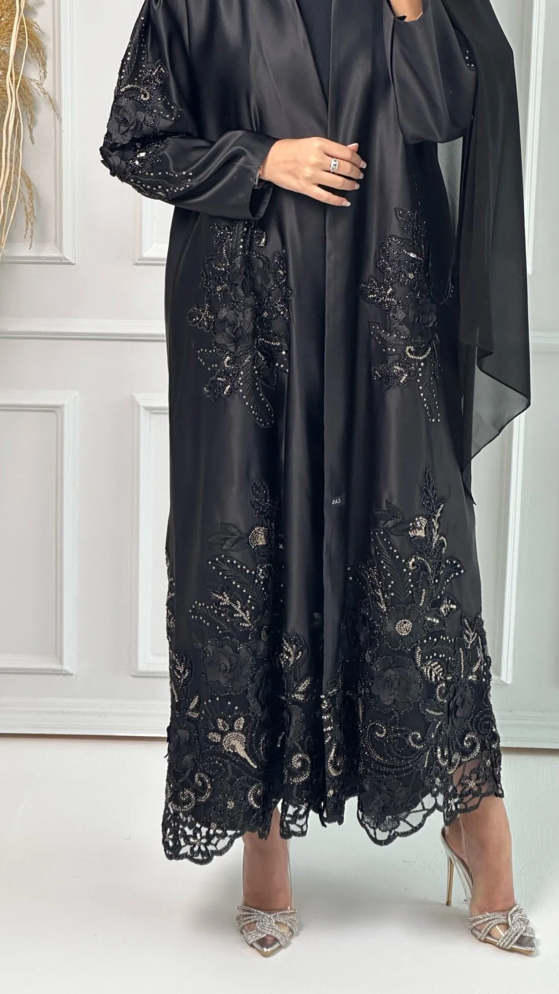 This luxurious black crepe evening abaya with shoulder pleats exudes elegance with its dantel panels on the front, hem and sleeves. The 3D roses add an extra touch of sophistication.
