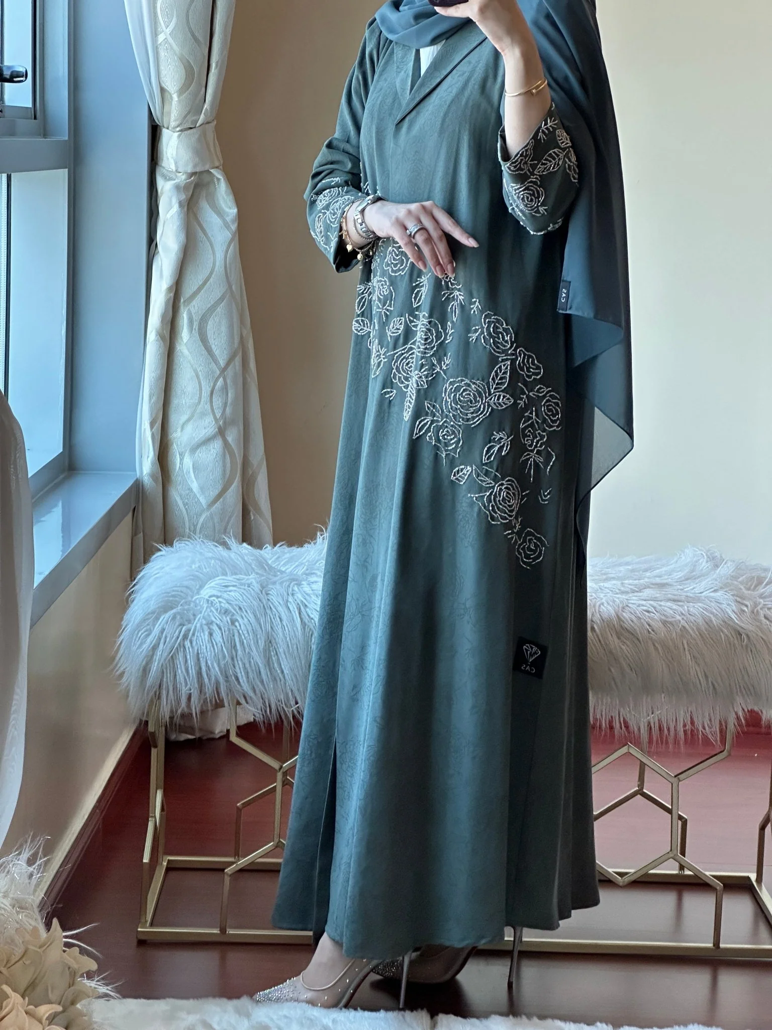 Coat style green floral print abaya with diagonally shaped silver beadwork and cuffed sleeves.