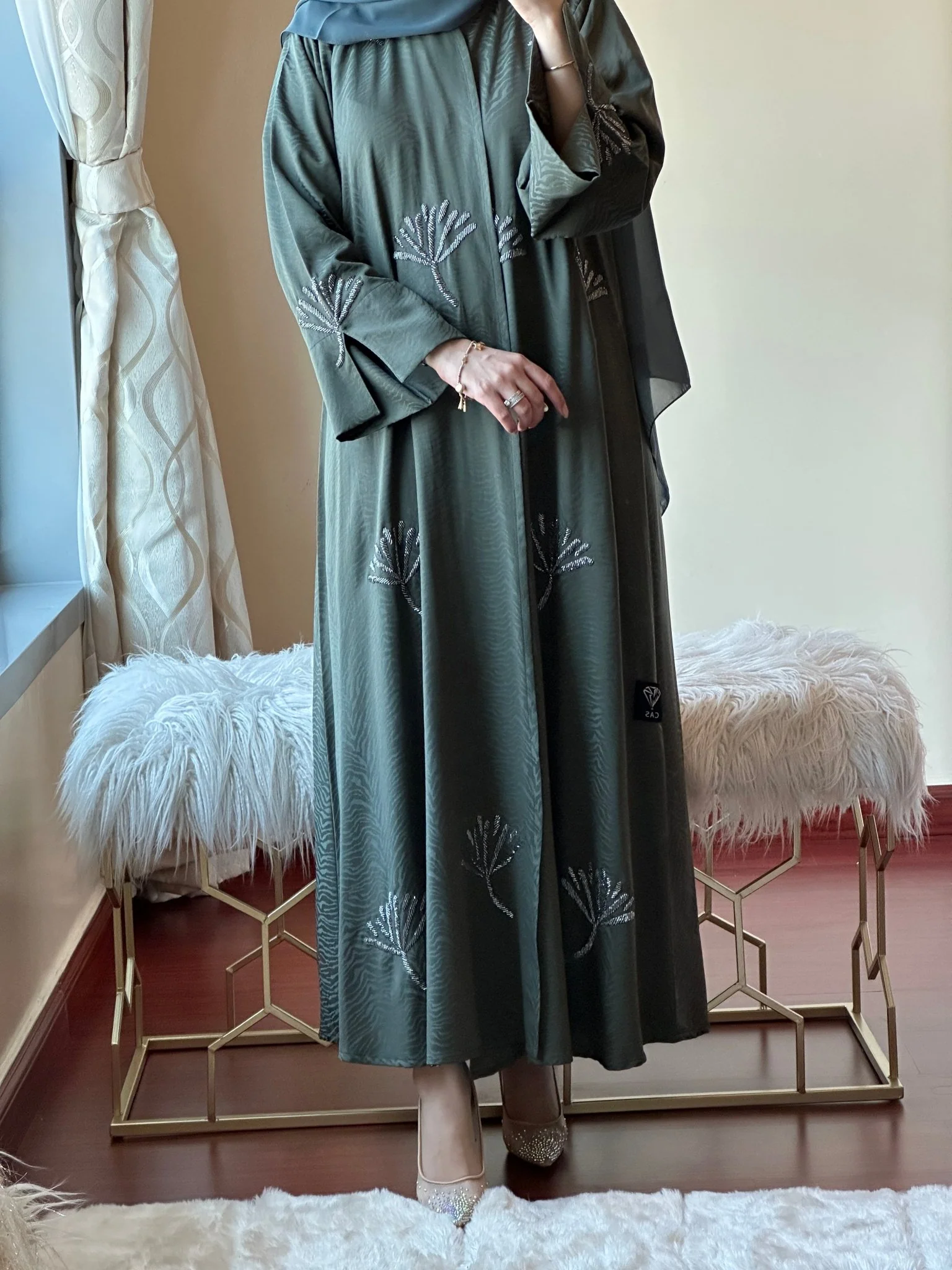 Bisht style animal print abaya with patches of silver palm trees with oversized sleeves.