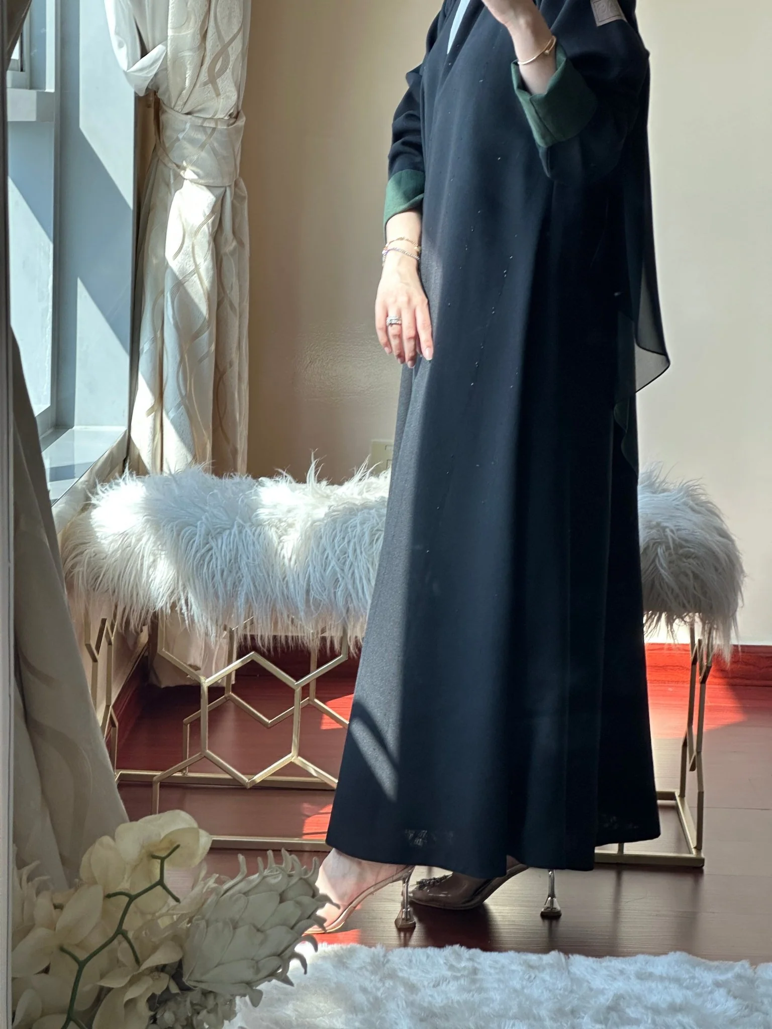 Winter Collection: Black/green reversible linen kloosh abaya with folded cuff sleeves.