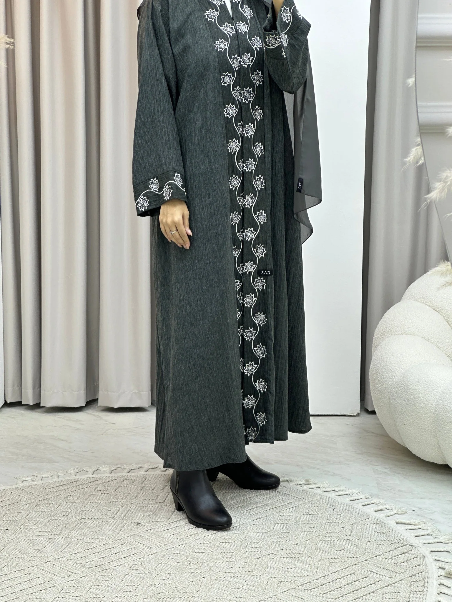 C RTW Grey Embroidery Linen Abaya