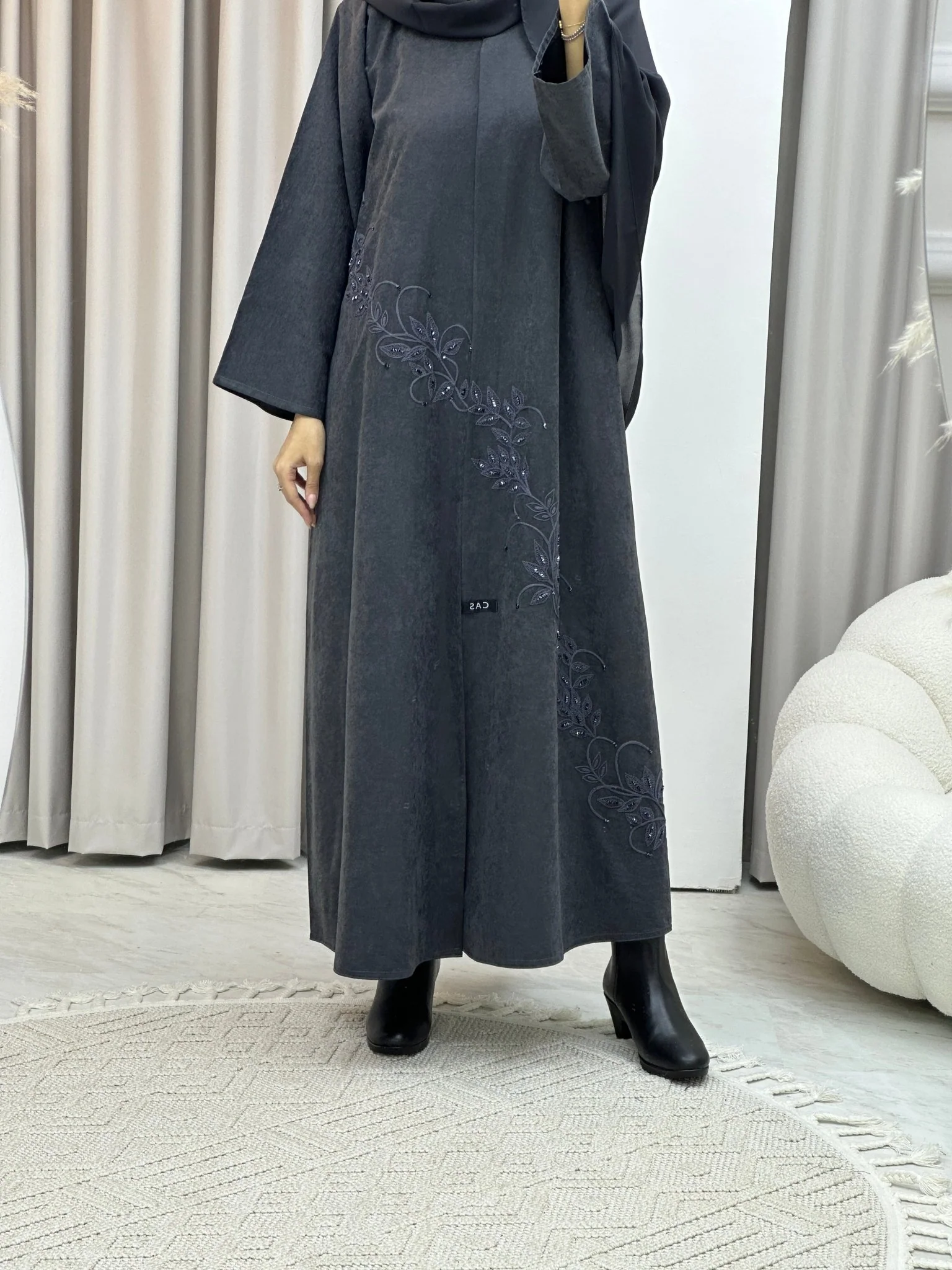 Stylish and sophisticated, it is crafted from finely woven suede, adorned with an intricate embroidery design, and finished with a grey hue that will flatter any figure.