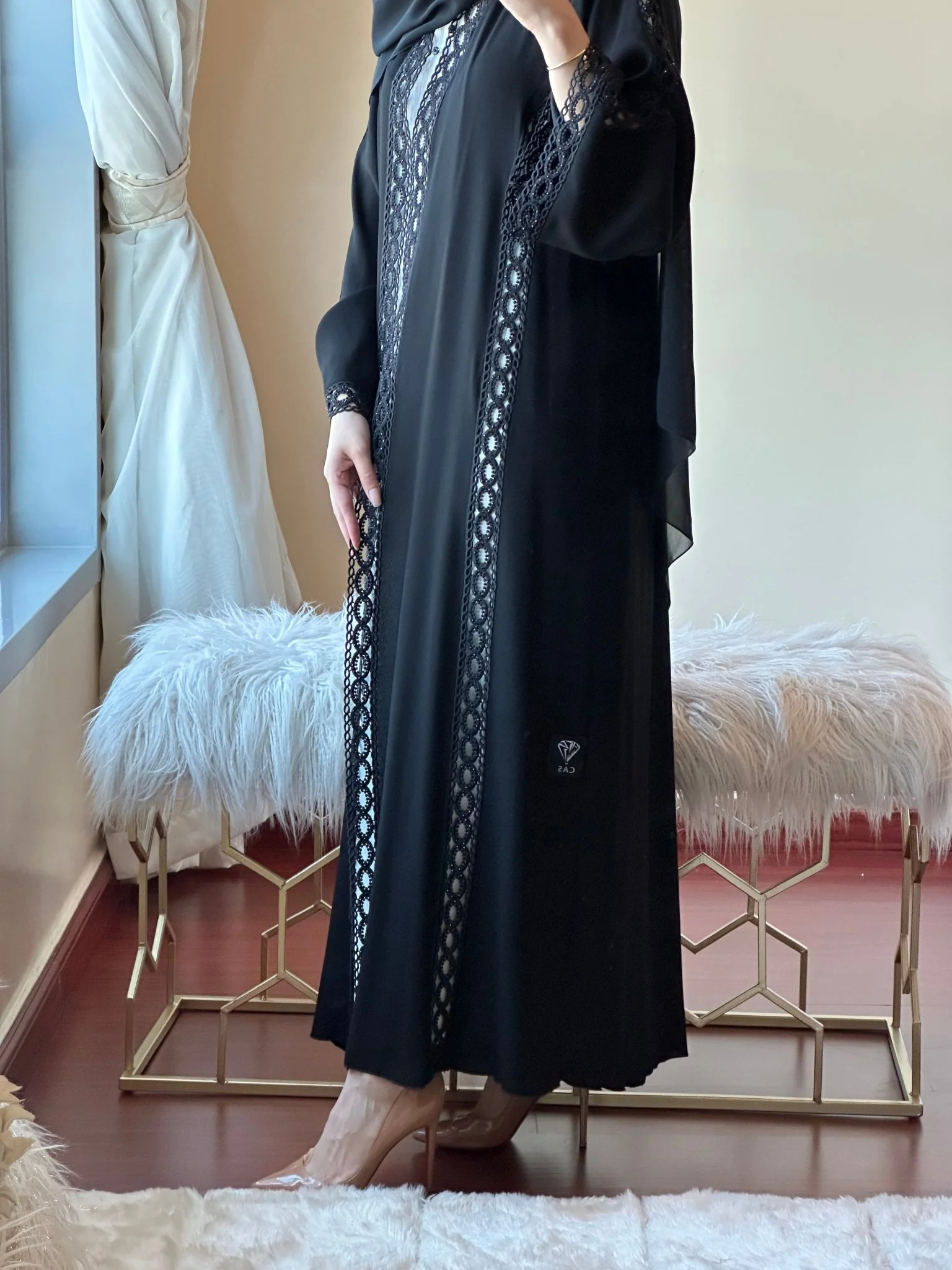 Straight cut abaya with intricately laced front and sleeves.
