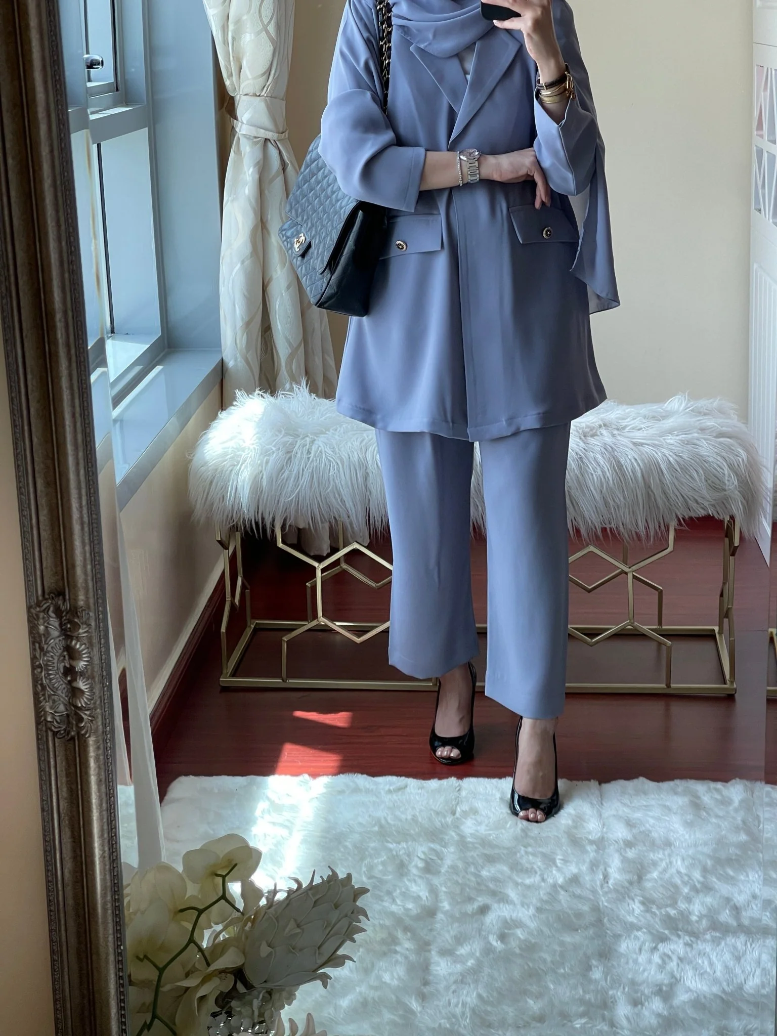 Introducing the CB-BlueGrey-Coat-Set, a stunning dubai abaya crafted from exquisite crepe color: blue grey garment care: dry clean duration: 12-14 days. This bespoke masterpiece embodies the perfect fusion of traditional elegance and contemporary sophistication, designed exclusively for the discerning woman who values both modesty and refined style.