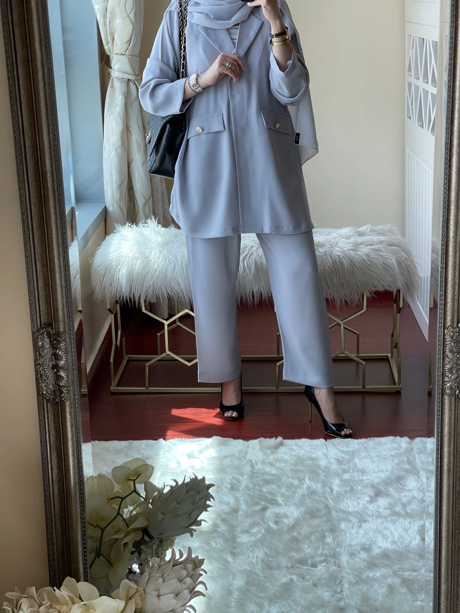 Introducing the CB-LightGrey-Coat-Set, a stunning dubai abaya crafted from exquisite crepe color: light grey garment care: dry clean duration: 12-14 days. This bespoke masterpiece embodies the perfect fusion of traditional elegance and contemporary sophistication, designed exclusively for the discerning woman who values both modesty and refined style.